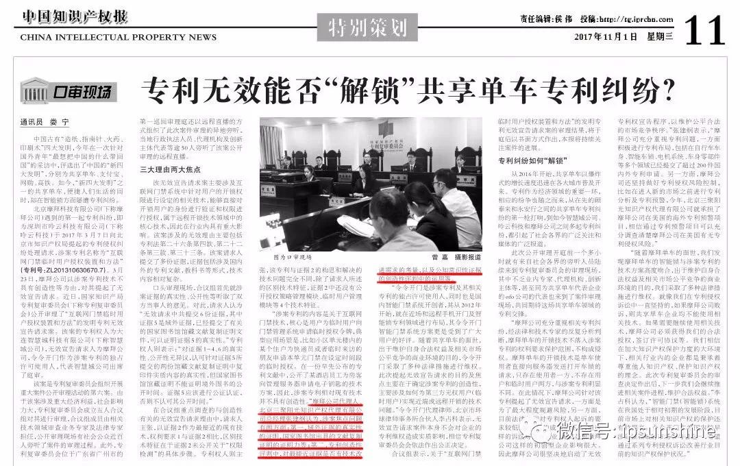 《中國知識產(chǎn)權(quán)報(bào)》專題報(bào)道我司代理的摩拜單車專利權(quán)無效宣告案