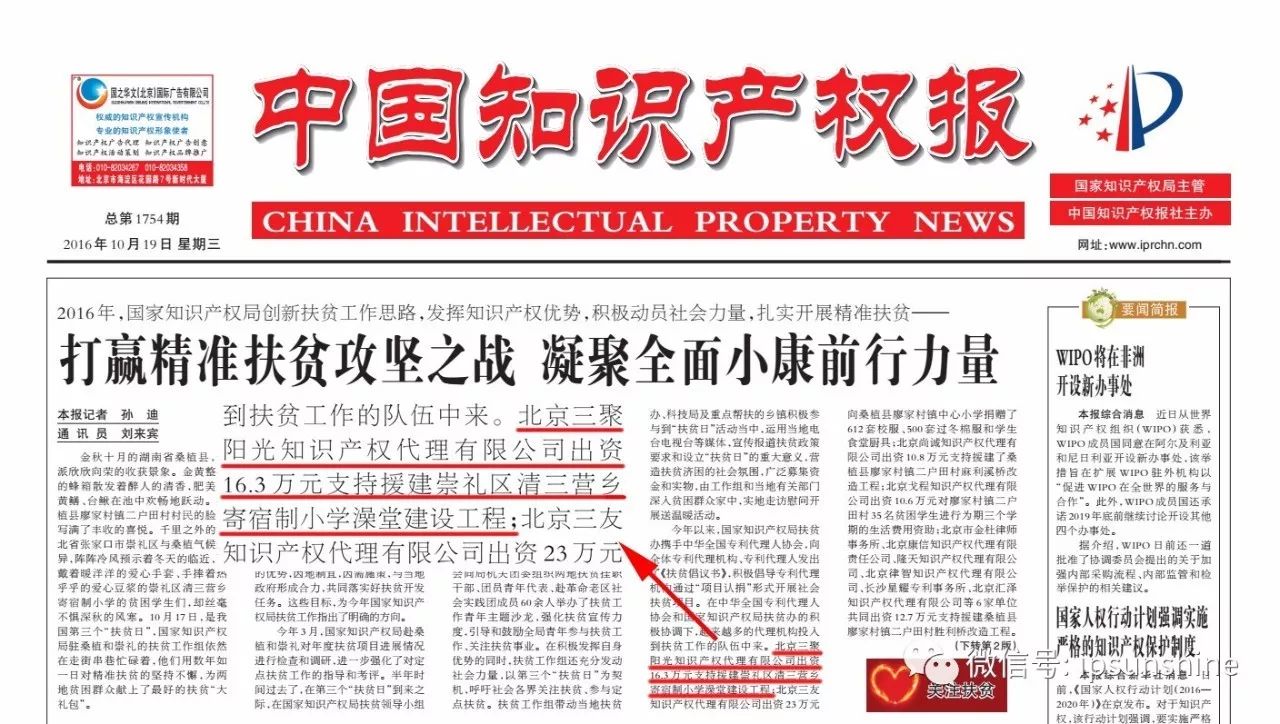 2016年10月,三聚陽(yáng)光出資16.3萬(wàn)元支持援建的崇禮清三營(yíng)鄉(xiāng)寄宿制小學(xué)澡堂建設(shè)工程項(xiàng)目順利竣工,中國(guó)知識(shí)產(chǎn)權(quán)報(bào)頭版頭條予以報(bào)道。年末,國(guó)家知識(shí)產(chǎn)權(quán)局專利局副局長(zhǎng)徐聰、中華全國(guó)專利代理人協(xié)會(huì)秘書長(zhǎng)徐媛媛一行赴崇禮調(diào)研扶貧工作時(shí)專程赴實(shí)地參觀考察。