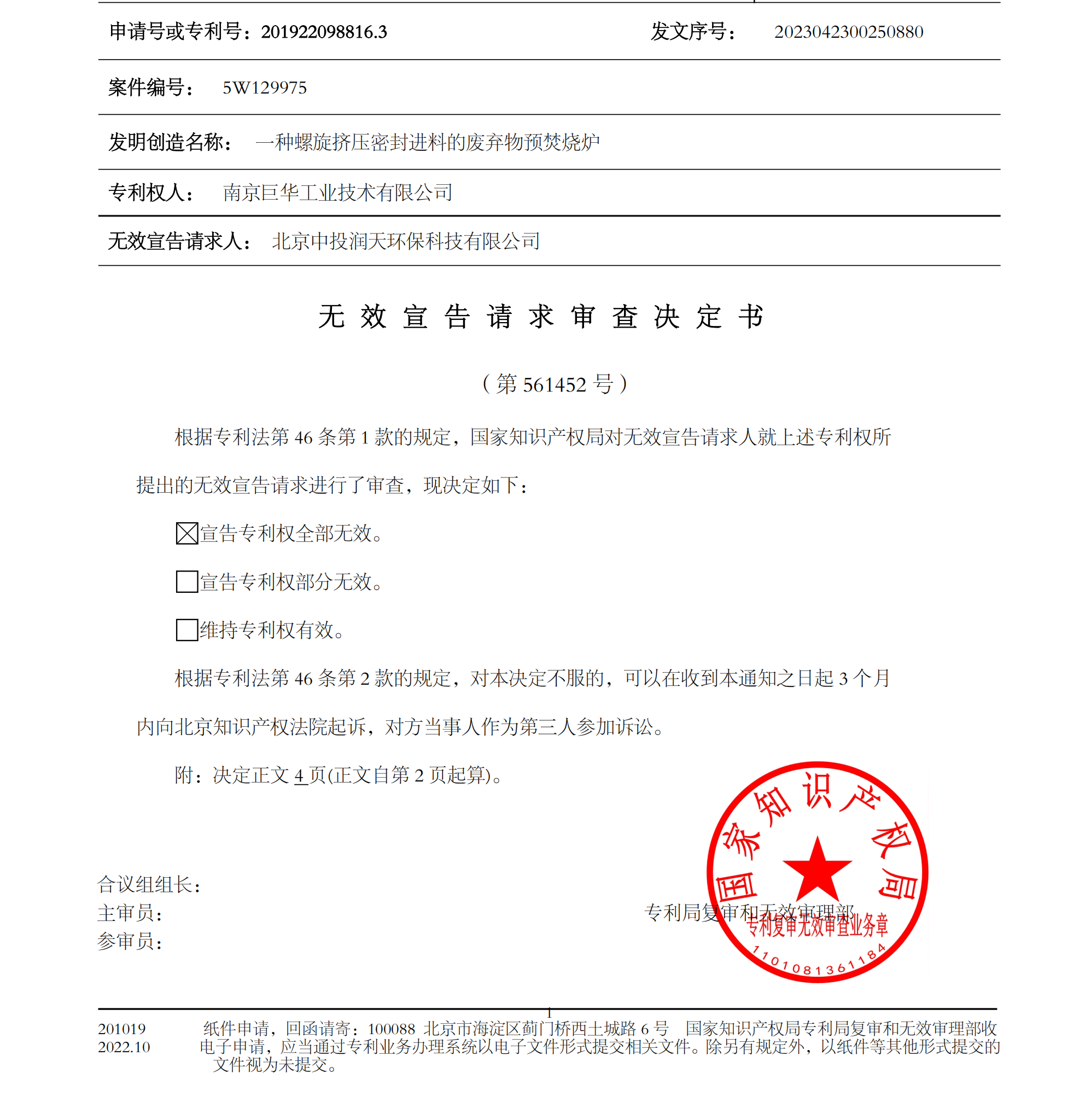 近日,由北京三聚陽光知識(shí)產(chǎn)權(quán)代理有限公司和北京易聚律師事務(wù)所聯(lián)合代理北京中投潤天環(huán)??萍加邢薰镜膶@麩o效宣告勝利結(jié)案。國家知識(shí)產(chǎn)權(quán)局作出第 561452 號(hào)無效審查決定,宣告南京巨華工業(yè)技術(shù)有限公司擁有的“一種螺旋擠壓密封進(jìn)料的廢棄物預(yù)焚燒爐”實(shí)用新型專利權(quán)全部無效。
