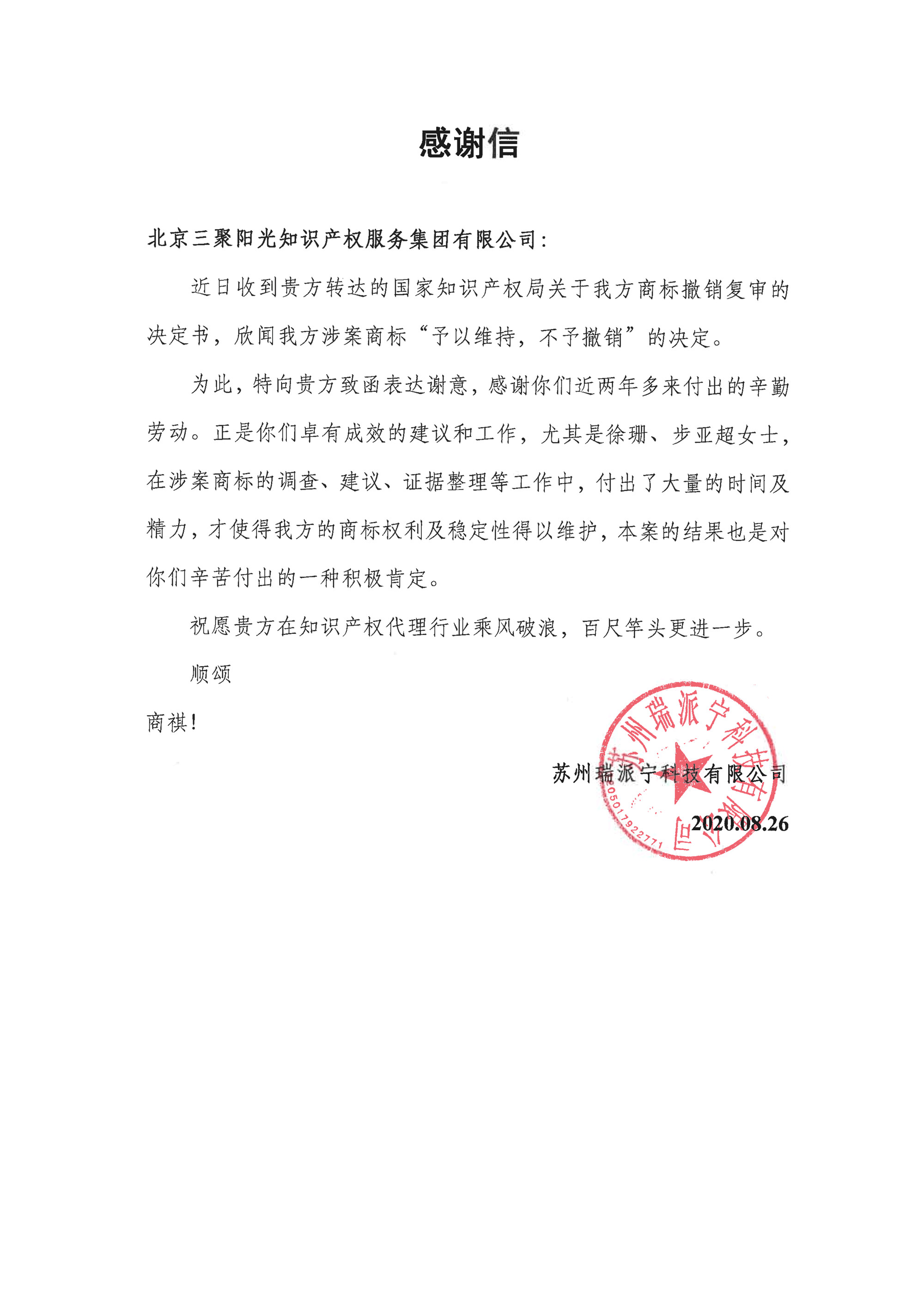 8月26日,三聚陽光收到蘇州瑞派寧科技有限公司(瑞派寧)發(fā)來的感謝信,信中表達(dá)了對三聚陽光商標(biāo)服務(wù)團(tuán)隊優(yōu)秀的業(yè)務(wù)能力和熱情的服務(wù)態(tài)度的感謝。