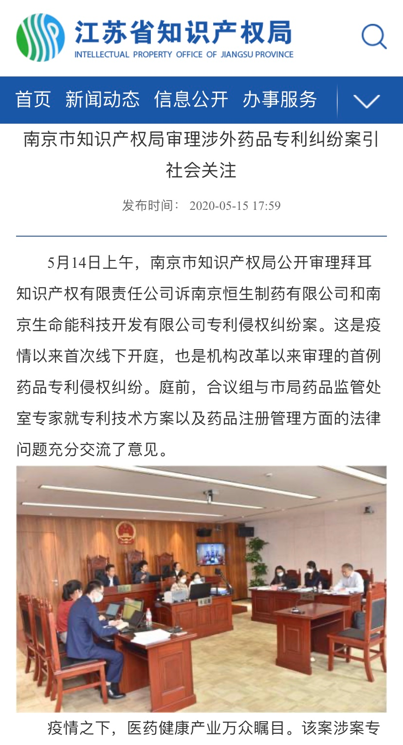 自疫情發(fā)生以來(lái),醫(yī)藥健康產(chǎn)業(yè)的動(dòng)態(tài)就一直備受矚目。而本案作為南京市知識(shí)產(chǎn)權(quán)局疫情后線(xiàn)下開(kāi)庭的第一案,到庭審現(xiàn)場(chǎng)旁聽(tīng)的律師、專(zhuān)利代理師、醫(yī)藥大學(xué)生、藥業(yè)企業(yè)代表等達(dá)四十多人。庭審結(jié)束后,江蘇省知識(shí)產(chǎn)權(quán)局在其網(wǎng)站對(duì)案件情況進(jìn)行了報(bào)道。