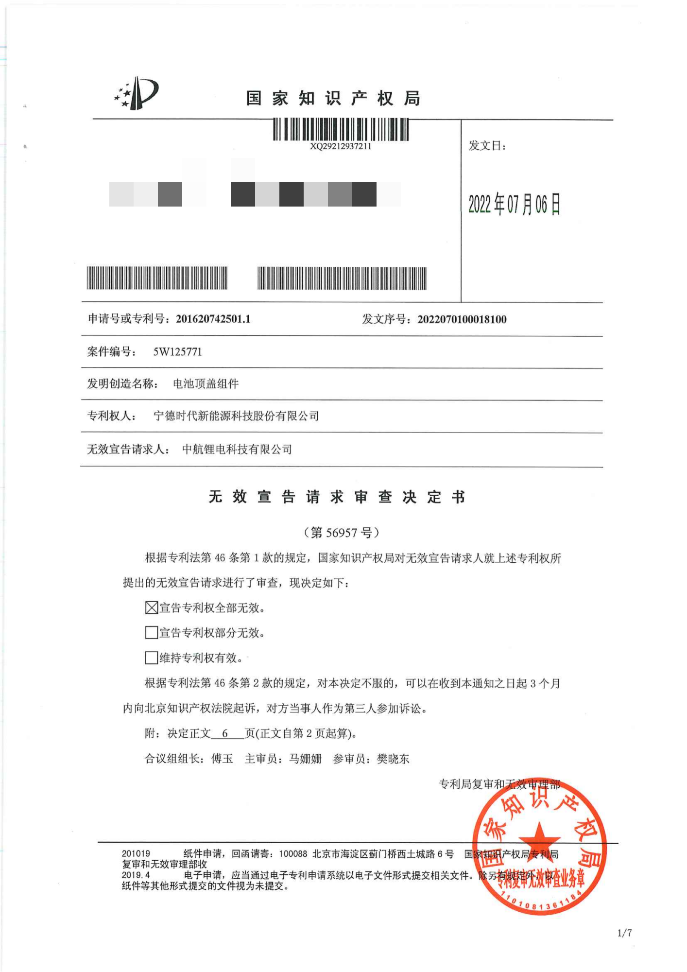 7月6日,國家知識產(chǎn)權(quán)局下發(fā)第56957號無效審查決定,宣告寧德時(shí)代新能源科技股份有限公司擁有的第201620742501號“電池頂蓋組件”專利全部無效。本案無效宣告請求人仍為中航鋰電科技有限公司(現(xiàn)名:中創(chuàng)新航科技股份有限公司),代理人還是北京三聚陽光知識產(chǎn)權(quán)代理有限公司和北京易聚律師事務(wù)所。