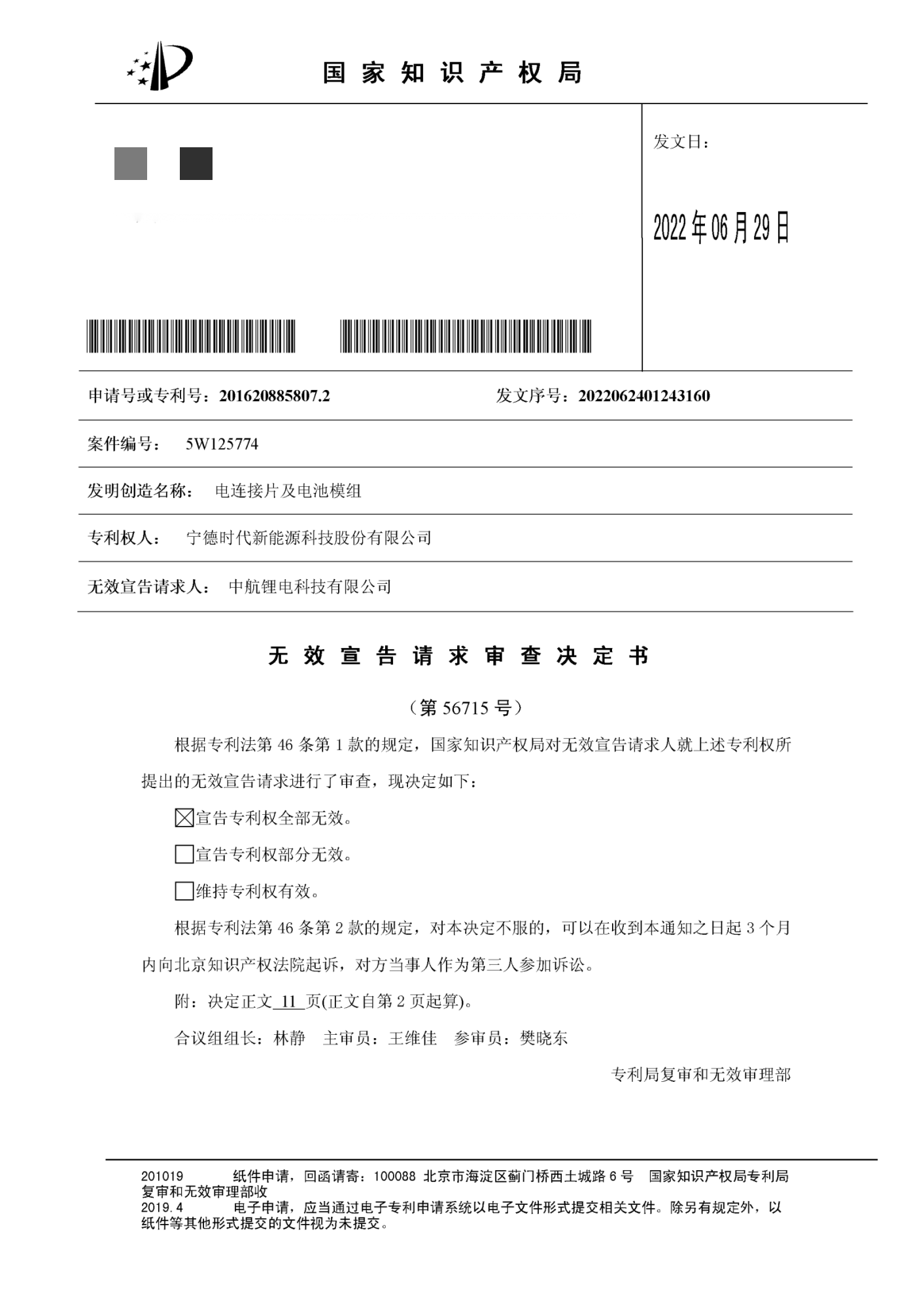 就在7天前的6月29日,國家知識產(chǎn)權(quán)局下發(fā)第56715號無效審查決定,宣告寧德時(shí)代新能源科技股份有限公司擁有的第201620885807號“電連接片及電池模組”專利全部無效。