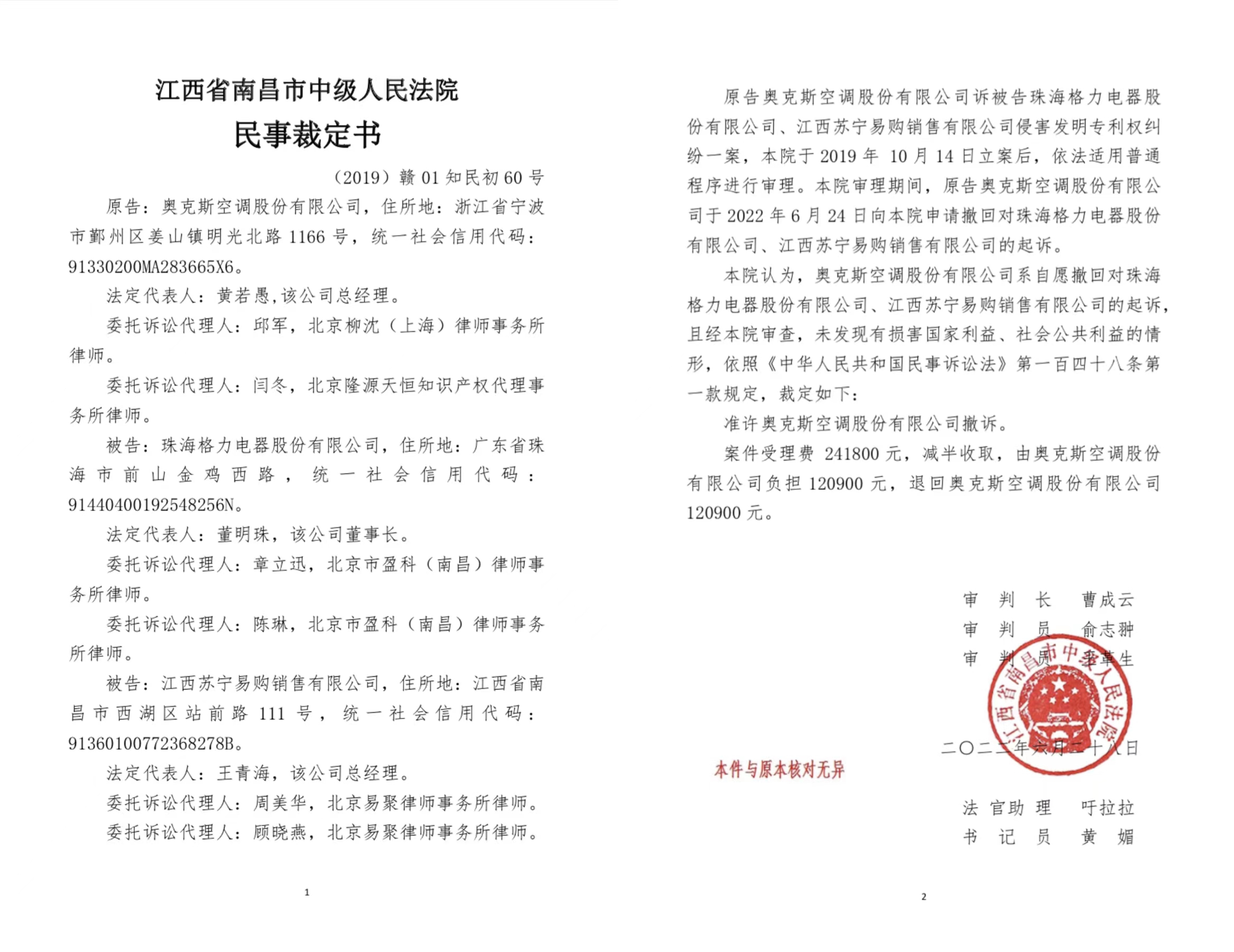 據(jù)兩件民事裁定書顯示,原告奧克斯空調(diào)股份有限公司訴被告珠海格力電器股份有限公司、江西蘇寧易購銷售有限公司侵害發(fā)明專利權(quán)糾紛一案,江西省南昌市中級人民法院于 2019 年 10 月 14 日立案后,依法適用普通程序進行審理。審理期間,原告奧克斯空調(diào)股份有限公司于 2022 年 6 月 24 日向江西省南昌市中級人民法院申請撤回對珠海格力電器股份有限公司、江西蘇寧易購銷售有限公司的起訴。