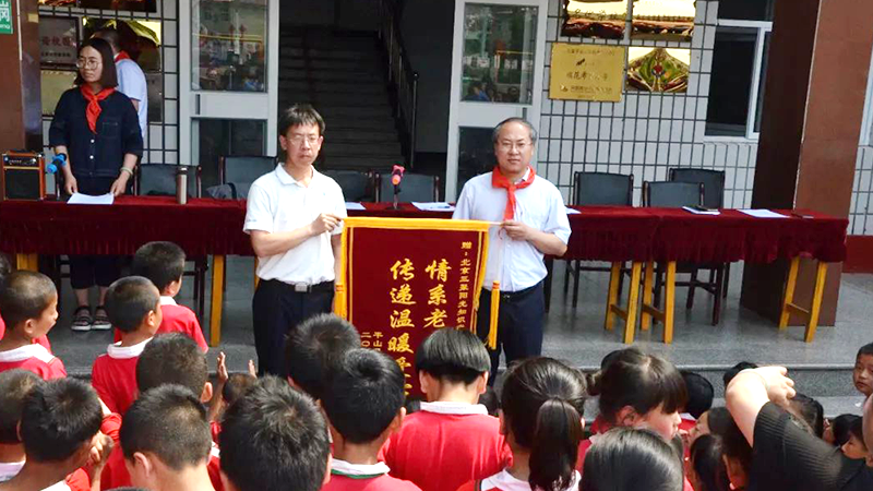 その後、河北省ハイテク企業(yè)協(xié)會、河北省科學(xué)技術(shù)企業(yè)インキュベーション協(xié)會、北京三聚陽光知的財(cái)産代理有限公司、河北日星法律事務(wù)所が、學(xué)校に必要なエアコンやパソコンなどの機(jī)材を寄付しました。少年先鋒隊(duì)の代表が、寄付団體のリーダーたちに鮮やかな赤いスカーフを結(jié)び、副校長の陳明龍氏が「溫かさと愛を伝え、革命區(qū)の教育を支える」という感謝の旗を贈呈し、記念撮影を行いました。