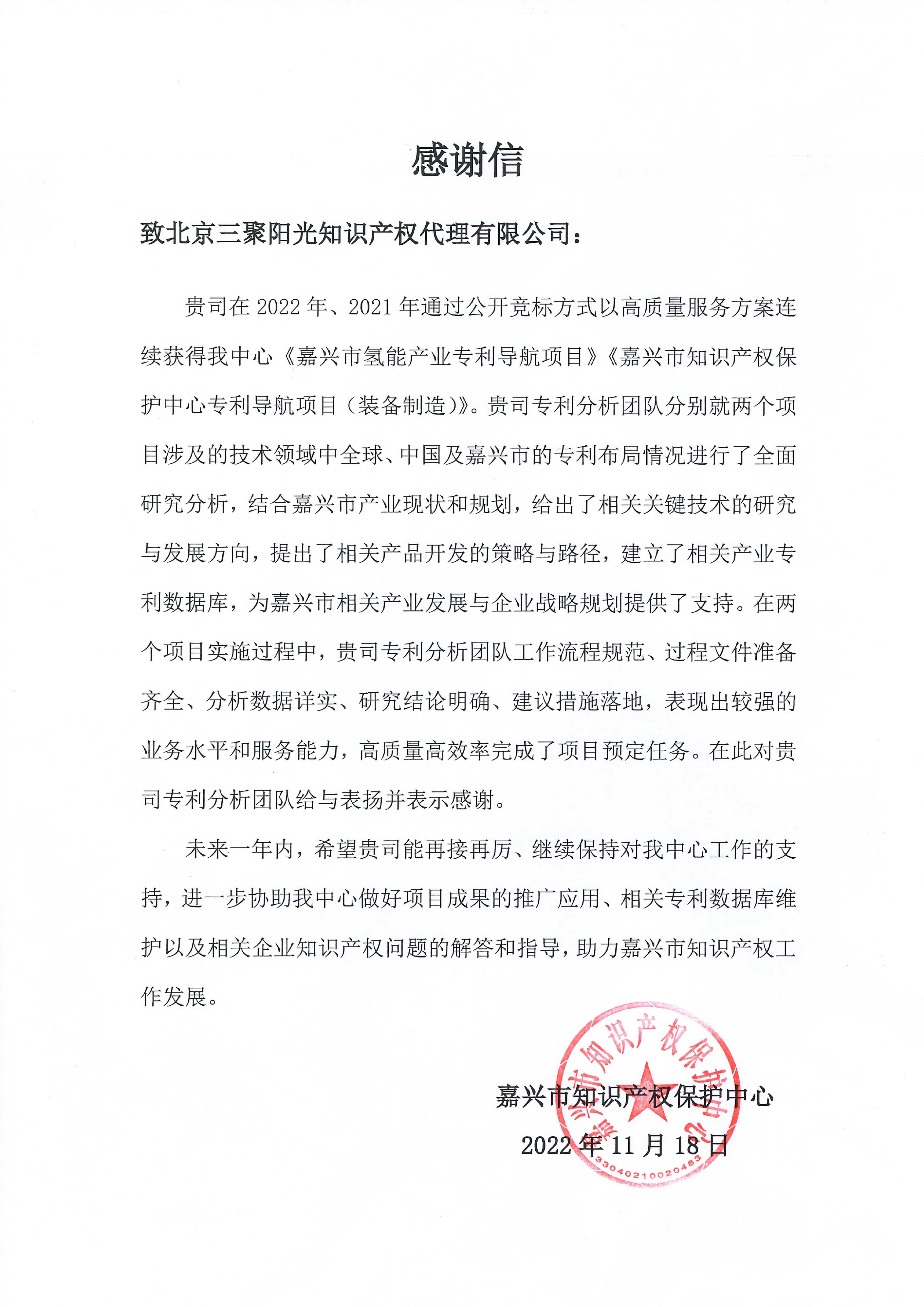 日前,三聚陽光收到了一封來自嘉興市知識產權保護中心的感謝信。信中提到,三聚陽光專利分析團隊在負責該中心的《嘉興市氫能產業(yè)專利導航項目》《嘉興市知識產權保護中心導航項目(裝備制造)》時,表現出了較強的業(yè)務水平和服務能力,高質量高效率完成了項目的預定任務,因而對三聚陽光專利分析團隊給與表揚并表示感謝。