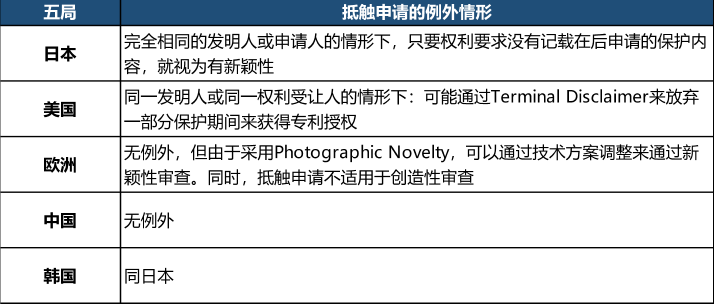 抵觸申請方面,由于各國規(guī)定不盡相同,有必要進(jìn)行簡單總結(jié)例外情形: